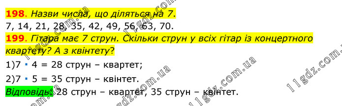 198. Назви числа, що діляться на 7. 7, 14, 21, 28, 35, 42, 49, 56, 63, 70. 199. Гітара має 7 струн. Скільки струн у всіх гітар із концертного квартету? А з квінтету? 1)7 ∙ 4 = 28 струн – квартет; 2)7 ∙ 5 = 35 струн – квінтет. Відповідь: 28 струн – квартет, 35 струн – квінтет.