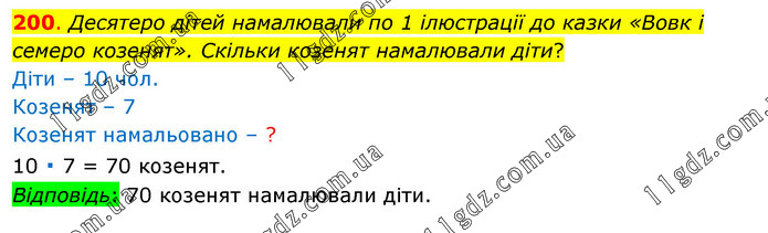 Десятеро дітей намалювали по 1 ілюстрації до казки «Вовк і семеро козенят». Скільки козенят намалювали діти? Діти – 10 чол. Козенят – 7 Козенят намальовано – ? 10 ∙ 7 = 70 козенят. Відповідь: 70 козенят намалювали діти.