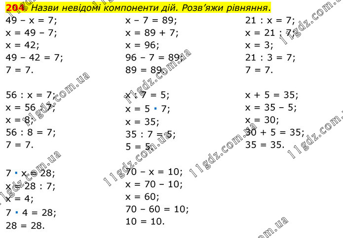 Назви невідомі компоненти дій. Розв’яжи рівняння. 49 – х = 7; x = 49 – 7; x = 42; 49 – 42 = 7; 7 = 7. х – 7 = 89; x = 89 + 7; x = 96; 96 – 7 = 89; 89 = 89. 21 : х = 7; x = 21 : 7; x = 3; 21 : 3 = 7; 7 = 7. 56 : х = 7; х = 56 : 7; х = 8; 56 : 8 = 7; 7 = 7. х : 7 = 5; х = 5 ∙ 7; х = 35; 35 : 7 = 5; 5 = 5. х + 5 = 35; х = 35 – 5; х = 30; 30 + 5 = 35; 35 = 35. 7 ∙ х = 28; х = 28 : 7; х = 4; 7 ∙ 4 = 28; 28 = 28. 70 – х = 10; х = 70 – 10; х = 60; 70 – 60 = 10; 10 = 10.