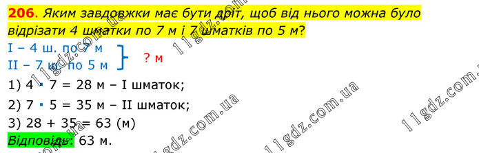 Яким завдовжки має бути дріт, щоб від нього можна було відрізати 4 шматки по 7 м і 7 шматків по 5 м? І – 4 ш. по 7 м ІІ – 7 ш. по 5 м 1) 4 ∙ 7 = 28 м – І шматок; 2) 7 ∙ 5 = 35 м – ІІ шматок; 3) 28 + 35 = 63 (м) Відповідь: 63 м.