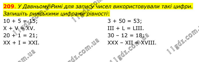У Давньому Римі для запису чисел використовували такі цифри. Запишіть римськими цифрами рівності: 10 + 5 = 15; X + V = XV. 20 + 1 = 21; XX + I = XXI. 3 + 50 = 53; III + L = LIII. 30 – 12 = 18; XXX – XII = XVIII.