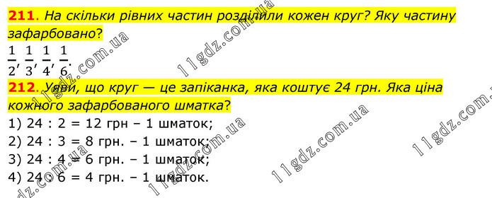 211. На скільки рівних частин розділили кожен круг? Яку частину зафарбовано? 1/2, 1/3, 1/4, 1/6. 212. Уяви, що круг — це запіканка, яка коштує 24 грн. Яка ціна кожного зафарбованого шматка? 1) 24 : 2 = 12 грн – 1 шматок; 2) 24 : 3 = 8 грн. – 1 шматок; 3) 24 : 4 = 6 грн. – 1 шматок; 4) 24 : 6 = 4 грн. – 1 шматок.