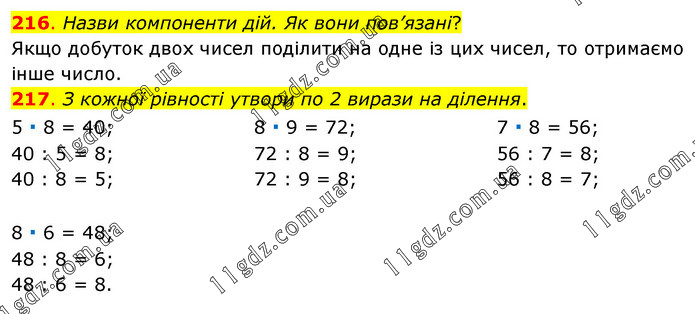 216. Назви компоненти дій. Як вони пов’язані? Якщо добуток двох чисел поділити на одне із цих чисел, то отримаємо інше число. 217. З кожної рівності утвори по 2 вирази на ділення. 5 ∙ 8 = 40; 40 : 5 = 8; 40 : 8 = 5; 8 ∙ 9 = 72; 72 : 8 = 9; 72 : 9 = 8; 7 ∙ 8 = 56; 56 : 7 = 8; 56 : 8 = 7; 8 ∙ 6 = 48; 48 : 8 = 6; 48 : 6 = 8.