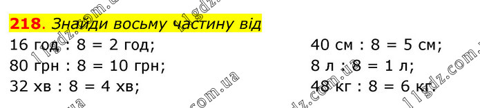 Знайди восьму частину від 16 год : 8 = 2 год; 80 грн : 8 = 10 грн; 32 хв : 8 = 4 хв; 40 см : 8 = 5 см; 8 л : 8 = 1 л; 48 кг : 8 = 6 кг.