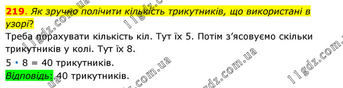 Як зручно полічити кількість трикутників, що використані в узорі? Треба порахувати кількість кіл. Тут їх 5. Потім з’ясовуємо скільки трикутників у колі. Тут їх 8. 5 ∙ 8 = 40 трикутників. Відповідь: 40 трикутників.