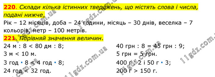 220. Склади кілька істинних тверджень, що містять слова і числа, подані нижче. Рік – 12 місяців, доба – 24 години, місяць – 30 днів, веселка – 7 кольорів, метр – 100 метрів. 221. Порівняй значення величин. 24 м : 8 < 80 дм : 8; 3 м < 10 м. 3 год ∙ 8 < 4 год ∙ 8; 24 год < 32 год. 40 грн : 8 = 45 грн : 9; 5 грн = 5 грн. 400 г : 2 і 50 г ∙ 3; 200 г > 150 г.