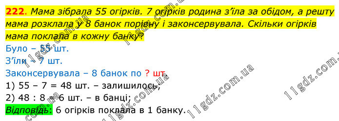 Мама зібрала 55 огірків. 7 огірків родина з’їла за обідом, а решту мама розклала у 8 банок порівну і законсервувала. Скільки огірків мама поклала в кожну банку? Було – 55 шт. З’їли – 7 шт. Законсервувала – 8 банок по ? шт. 1) 55 – 7 = 48 шт. – залишилось; 2) 48 : 8 = 6 шт. – в банці; Відповідь: 6 огірків поклала в 1 банку.