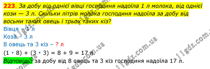 За добу від однієї вівці господиня надоїла 1 л молока, від однієї кози — 3 л. Скільки літрів молока господиня надоїла за добу від восьми таких овець і трьох таких кіз? Вівця – 1 л Коза – 3 л 8 овець та 3 кіз – ? л (1 ∙ 8) + (3 ∙ 3) = 8 + 9 = 17 л. Відповідь: за добу від 8 овець та 3 кіз господиня надоїла 17 л.