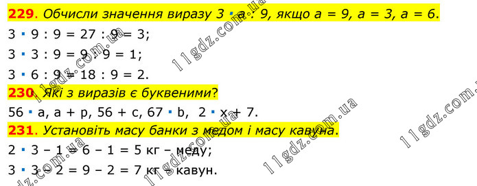 229. Обчисли значення виразу 3 ∙ а : 9, якщо а = 9, а = 3, а = 6. 3 ∙ 9 : 9 = 27 : 9 = 3; 3 ∙ 3 : 9 = 9 : 9 = 1; 3 ∙ 6 : 9 = 18 : 9 = 2. 230. Які з виразів є буквеними? 56 ∙ а, а + р, 56 + с, 67 ∙ b, 2 ∙ х + 7. 231. Установіть масу банки з медом і масу кавуна. 2 ∙ 3 – 1 = 6 – 1 = 5 кг – меду; 3 ∙ 3 – 2 = 9 – 2 = 7 кг – кавун.
