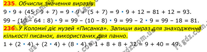 235. Обчисли значення виразів. 9 ∙ 9 + (45 : 9 + 7) = 9 ∙ 9 + (5 + 7) = 9 ∙ 9 + 12 = 81 + 12 = 93. 99 – (10 – 64 : 8) ∙ 9 = 99 – (10 – 8) ∙ 9 = 99 – 2 ∙ 9 = 99 – 18 = 81. 236. У Коломиї діє музей «Писанка». Запиши вираз для знаходження кількості писанок, використаних для панно. 1 + (2 ∙ 4) + (2 ∙ 4) + (8 ∙ 4) = 1 + 8 + 8 + 32 = 9 + 40 = 49.