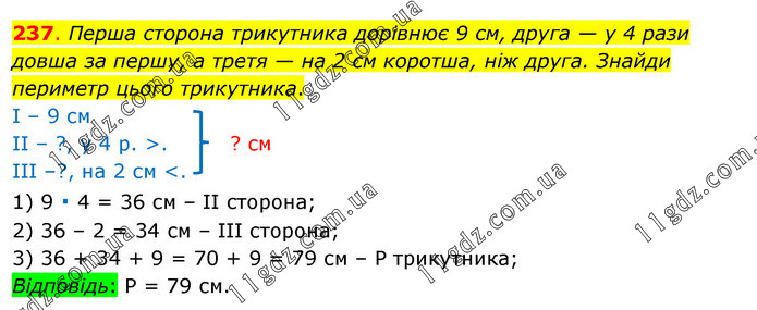 Перша сторона трикутника дорівнює 9 см, друга — у 4 рази довша за першу, а третя — на 2 см коротша, ніж друга. Знайди периметр цього трикутника. І – 9 см ІІ – ?, у 4 р. >. ? см ІІІ –?, на 2 см <. 1) 9 ∙ 4 = 36 см – ІІ сторона; 2) 36 – 2 = 34 см – ІІІ сторона; 3) 36 + 34 + 9 = 70 + 9 = 79 см – Р трикутника; Відповідь: Р = 79 см.