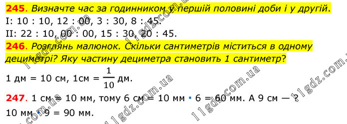 245. Визначте час за годинником у першій половині доби і у другій. І: 10 : 10, 12 : 00, 3 : 30, 8 : 45. ІІ: 22 : 10, 00 : 00, 15 : 30, 20 : 45. 246. Розглянь малюнок. Скільки сантиметрів міститься в одному дециметрі? Яку частину дециметра становить 1 сантиметр? 1 дм = 10 см, 1см = 1/10 дм. 247. 1 см = 10 мм, тому 6 см = 10 мм ∙ 6 = 60 мм. А 9 см — ? 10 мм ∙ 9 = 90 мм.