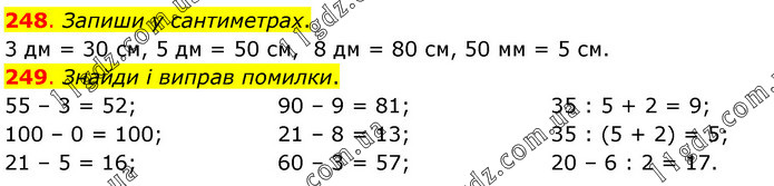 248. Запиши у сантиметрах. 3 дм = 30 см, 5 дм = 50 см, 8 дм = 80 см, 50 мм = 5 см. 249. Знайди і виправ помилки. 55 – 3 = 52; 100 – 0 = 100; 21 – 5 = 16; 90 – 9 = 81; 21 – 8 = 13; 60 – 3 = 57; 35 : 5 + 2 = 9; 35 : (5 + 2) = 5; 20 – 6 : 2 = 17.