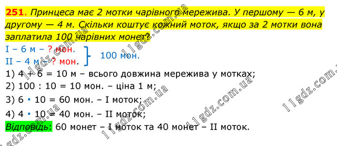 Принцеса має 2 мотки чарівного мережива. У першому — 6 м, у другому — 4 м. Скільки коштує кожний моток, якщо за 2 мотки вона заплатила 100 чарівних монет? І – 6 м – ? мон. ІІ – 4 м – ? мон. 1) 4 + 6 = 10 м – всього довжина мережива у мотках; 2) 100 : 10 = 10 мон. – ціна 1 м; 3) 6 ∙ 10 = 60 мон. – І моток; 4) 4 ∙ 10 = 40 мон. – ІІ моток; Відповідь: 60 монет – І моток та 40 монет – ІІ моток.