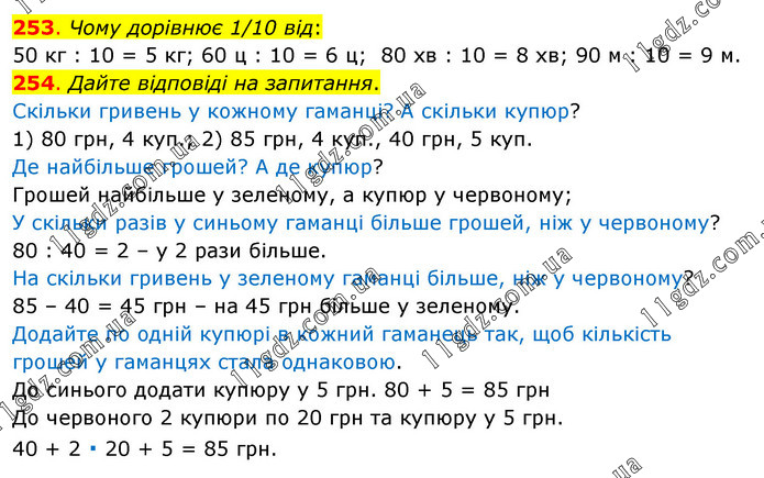 253. Чому дорівнює 1/10 від: 50 кг : 10 = 5 кг; 60 ц : 10 = 6 ц; 80 хв : 10 = 8 хв; 90 м : 10 = 9 м. 254. Дайте відповіді на запитання. Скільки гривень у кожному гаманці? А скільки купюр? 1) 80 грн, 4 куп.; 2) 85 грн, 4 куп., 40 грн, 5 куп. Де найбільше грошей? А де купюр? Грошей найбільше у зеленому, а купюр у червоному; У скільки разів у синьому гаманці більше грошей, ніж у червоному? 80 : 40 = 2 – у 2 рази більше. На скільки гривень у зеленому гаманці більше, ніж у червоному? 85 – 40 = 45 грн – на 45 грн більше у зеленому. Додайте по одній купюрі в кожний гаманець так, щоб кількість грошей у гаманцях стала однаковою. До синього додати купюру у 5 грн. 80 + 5 = 85 грн До червоного 2 купюри по 20 грн та купюру у 5 грн. 40 + 2 ∙ 20 + 5 = 85 грн.