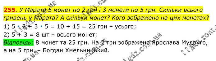 У Марата 5 монет по 2 грн і 3 монети по 5 грн. Скільки всього гривень у Марата? А скільки монет? Кого зображено на цих монетах? 1) 5 ∙ 2 + 3 ∙ 5 = 10 + 15 = 25 грн – усього; 2) 5 + 3 = 8 шт – всього монет; Відповідь: 8 монет та 25 грн. На 2 грн зображено Ярослава Мудруго, а на 5 грн. – Богдан Хмельницький.