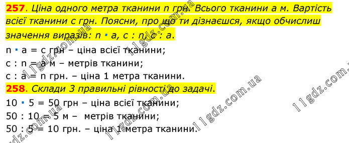 257. Ціна одного метра тканини n грн. Всього тканини а м. Вартість всієї тканини с грн. Поясни, про що ти дізнаєшся, якщо обчислиш значення виразів: n ∙ а, с : n, с : а. n ∙ а = с грн – ціна всієї тканини; с : n = а м – метрів тканини; с : а = n грн. – ціна 1 метра тканини. 258. Склади 3 правильні рівності до задачі. 10 ∙ 5 = 50 грн – ціна всієї тканини; 50 : 10 = 5 м – метрів тканини; 50 : 5 = 10 грн. – ціна 1 метра тканини.