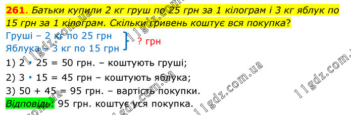 Батьки купили 2 кг груш по 25 грн за 1 кілограм і 3 кг яблук по 15 грн за 1 кілограм. Скільки гривень коштує вся покупка? Груші – 2 кг по 25 грн Яблука – 3 кг по 15 грн 1) 2 ∙ 25 = 50 грн. – коштують груші; 2) 3 ∙ 15 = 45 грн – коштують яблука; 3) 50 + 45 = 95 грн. – вартість покупки. Відповідь: 95 грн. коштує уся покупка.