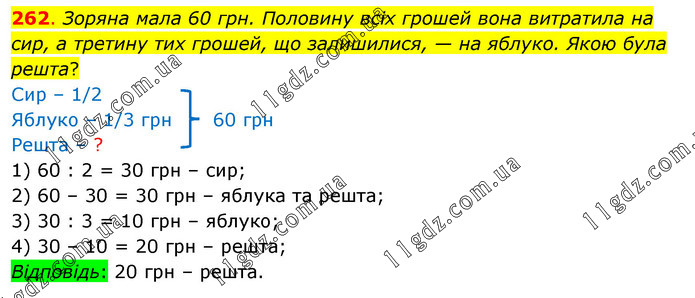 Зоряна мала 60 грн. Половину всіх грошей вона витратила на сир, а третину тих грошей, що залишилися, — на яблуко. Якою була решта? Сир – 1/2 Яблуко – 1/3 грн 60 грн Решта – ? 1) 60 : 2 = 30 грн – сир; 2) 60 – 30 = 30 грн – яблука та решта; 3) 30 : 3 = 10 грн – яблуко; 4) 30 – 10 = 20 грн – решта; Відповідь: 20 грн – решта.
