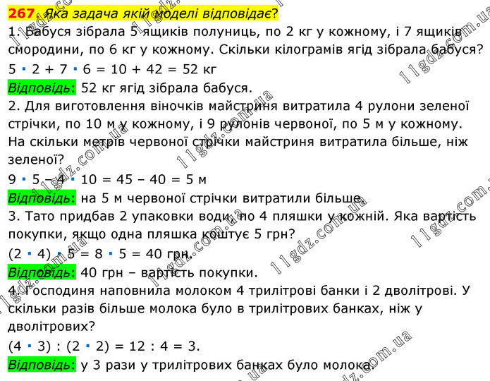 Яка задача якій моделі відповідає? 1. Бабуся зібрала 5 ящиків полуниць, по 2 кг у кожному, і 7 ящиків смородини, по 6 кг у кожному. Скільки кілограмів ягід зібрала бабуся? 5 ∙ 2 + 7 ∙ 6 = 10 + 42 = 52 кг Відповідь: 52 кг ягід зібрала бабуся. 2. Для виготовлення віночків майстриня витратила 4 рулони зеленої стрічки, по 10 м у кожному, і 9 рулонів червоної, по 5 м у кожному. На скільки метрів червоної стрічки майстриня витратила більше, ніж зеленої? 9 ∙ 5 – 4 ∙ 10 = 45 – 40 = 5 м Відповідь: на 5 м червоної стрічки витратили більше. 3. Тато придбав 2 упаковки води, по 4 пляшки у кожній. Яка вартість покупки, якщо одна пляшка коштує 5 грн? (2 ∙ 4) ∙ 5 = 8 ∙ 5 = 40 грн. Відповідь: 40 грн – вартість покупки. 4. Господиня наповнила молоком 4 трилітрові банки і 2 дволітрові. У скільки разів більше молока було в трилітрових банках, ніж у дволітрових? (4 ∙ 3) : (2 ∙ 2) = 12 : 4 = 3. Відповідь: у 3 рази у трилітрових банках було молока.