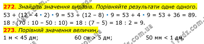 272. Знайдіть значення виразів. Порівняйте результати одне одного. 53 + (12 – 4 ∙ 2) ∙ 9 = 53 + (12 – 8) ∙ 9 = 53 + 4 ∙ 9 = 53 + 36 = 89. 18 : (70 : 10 – 50 : 10) = 18 : (7 – 5) = 18 : 2 = 9. 273. Порівняй значення величин. 1 м < 45 дм; 60 см > 5 дм; 50 мм < 1 дм.