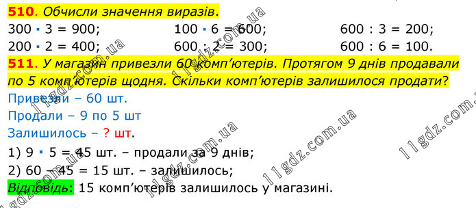 510. Обчисли значення виразів. 300 ∙ 3 = 900; 200 ∙ 2 = 400; 100 ∙ 6 = 600; 600 : 2 = 300; 600 : 3 = 200; 600 : 6 = 100. 511. У магазин привезли 60 комп’ютерів. Протягом 9 днів продавали по 5 комп’ютерів щодня. Скільки комп’ютерів залишилося продати? Привезли – 60 шт. Продали – 9 по 5 шт Залишилось – ? шт. 1) 9 ∙ 5 = 45 шт. – продали за 9 днів; 2) 60 – 45 = 15 шт. – залишилось; Відповідь: 15 комп’ютерів залишилось у магазині.