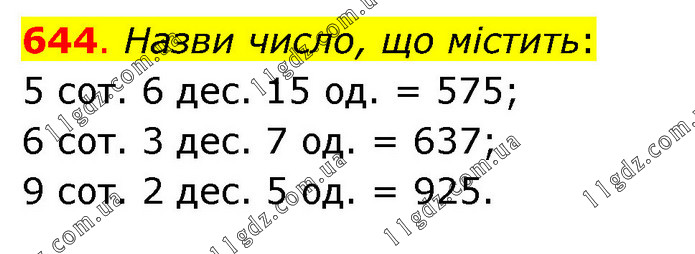 Назви число, що містить: 5 сот. 6 дес. 15 од. = 575; 6 сот. 3 дес. 7 од. = 637; 9 сот. 2 дес. 5 од. = 925.