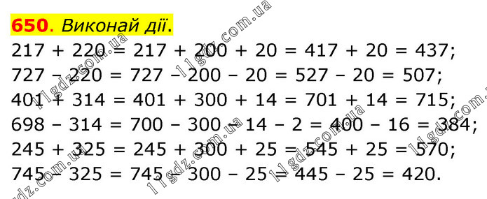 Виконай дії. 217 + 220 = 217 + 200 + 20 = 417 + 20 = 437; 727 – 220 = 727 – 200 – 20 = 527 – 20 = 507; 401 + 314 = 401 + 300 + 14 = 701 + 14 = 715; 698 – 314 = 700 – 300 – 14 – 2 = 400 – 16 = 384; 245 + 325 = 245 + 300 + 25 = 545 + 25 = 570; 745 – 325 = 745 – 300 – 25 = 445 – 25 = 420.