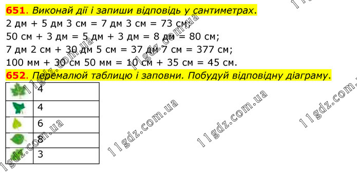 651. Виконай дії і запиши відповідь у сантиметрах. 2 дм + 5 дм 3 см = 7 дм 3 см = 73 см; 50 см + 3 дм = 5 дм + 3 дм = 8 дм = 80 см; 7 дм 2 см + 30 дм 5 см = 37 дм 7 см = 377 см; 100 мм + 30 см 50 мм = 10 см + 35 см = 45 см. 652. Перемалюй таблицю і заповни. Побудуй відповідну діаграму.