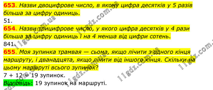 653. Назви двоцифрове число, в якому цифра десятків у 5 разів більша за цифру одиниць. 51. 654. Назви трицифрове число, у якого цифра десятків у 4 рази більша за цифру одиниць і на 4 менша від цифри сотень. 841. 655. Моя зупинка трамвая — сьома, якщо лічити з одного кінця маршруту, і дванадцята, якщо лічити від іншого кінця. Скільки на цьому маршруті всього зупинок? 7 + 12 = 19 зупинок. Відповідь: 19 зупинок на маршруті.