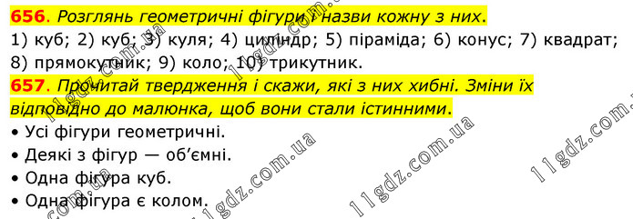 656. Розглянь геометричні фігури і назви кожну з них. 1) куб; 2) куб; 3) куля; 4) циліндр; 5) піраміда; 6) конус; 7) квадрат; 8) прямокутник; 9) коло; 10) трикутник. 657. Прочитай твердження і скажи, які з них хибні. Зміни їх відповідно до малюнка, щоб вони стали істинними. • Усі фігури геометричні. • Деякі з фігур — об’ємні. • Одна фігура куб. • Одна фігура є колом.