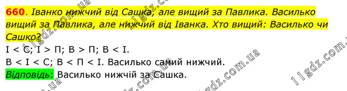 Іванко нижчий від Сашка, але вищий за Павлика. Василько вищий за Павлика, але нижчий від Іванка. Хто вищий: Василько чи Сашко? І < С; І > П; В > П; В < І. В < І < С; В < П < І. Василько самий нижчий. Відповідь: Василько нижчій за Сашка.