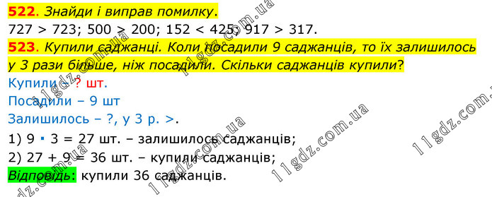 522. Знайди і виправ помилку. 727 > 723; 500 > 200; 152 < 425; 917 > 317. 523. Купили саджанці. Коли посадили 9 саджанців, то їх залишилось у 3 рази більше, ніж посадили. Скільки саджанців купили? Купили – ? шт. Посадили – 9 шт Залишилось – ?, у 3 р. >. 1) 9 ∙ 3 = 27 шт. – залишилось саджанців; 2) 27 + 9 = 36 шт. – купили саджанців; Відповідь: купили 36 саджанців.