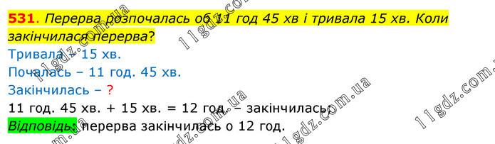 Перерва розпочалась об 11 год 45 хв і тривала 15 хв. Коли закінчилася перерва? Тривала – 15 хв. Почалась – 11 год. 45 хв. Закінчилась – ? 11 год. 45 хв. + 15 хв. = 12 год. – закінчилась; Відповідь: перерва закінчилась о 12 год.