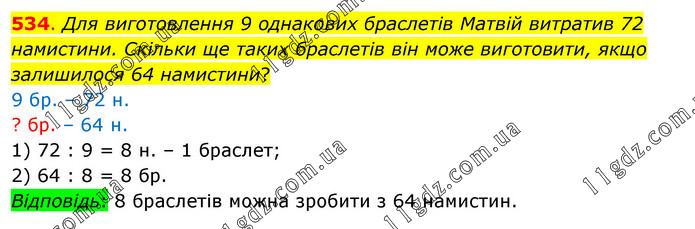 Для виготовлення 9 однакових браслетів Матвій витратив 72 намистини. Скільки ще таких браслетів він може виготовити, якщо залишилося 64 намистини? 9 бр. – 72 н. ? бр. – 64 н. 1) 72 : 9 = 8 н. – 1 браслет; 2) 64 : 8 = 8 бр. Відповідь: 8 браслетів можна зробити з 64 намистин.