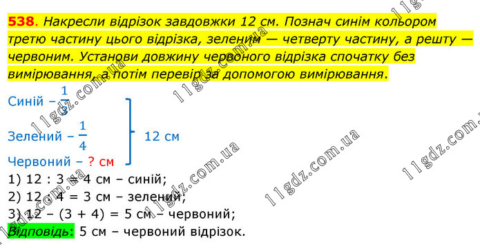 Накресли відрізок завдовжки 12 см. Познач синім кольором третю частину цього відрізка, зеленим — четверту частину, а решту — червоним. Установи довжину червоного відрізка спочатку без вимірювання, а потім перевір за допомогою вимірювання. Синій – 1/3 Зелений – 1/4 12 см Червоний – ? см 1) 12 : 3 = 4 см – синій; 2) 12 : 4 = 3 см – зелений; 3) 12 – (3 + 4) = 5 см – червоний; Відповідь: 5 см – червоний відрізок.