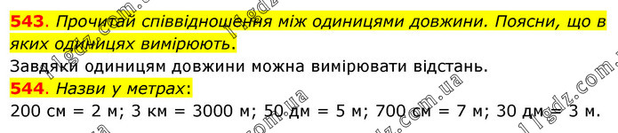 543. Прочитай співвідношення між одиницями довжини. Поясни, що в яких одиницях вимірюють. Завдяки одиницям довжини можна вимірювати відстань. 544. Назви у метрах: 200 см = 2 м; 3 км = 3000 м; 50 дм = 5 м; 700 см = 7 м; 30 дм = 3 м.