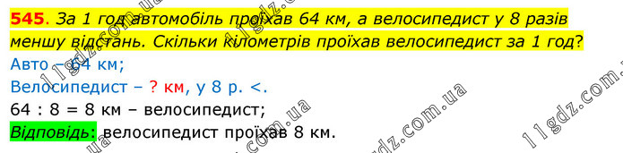 За 1 год автомобіль проїхав 64 км, а велосипедист у 8 разів меншу відстань. Скільки кілометрів проїхав велосипедист за 1 год? Авто – 64 км; Велосипедист – ? км, у 8 р. <. 64 : 8 = 8 км – велосипедист; Відповідь: велосипедист проїхав 8 км.