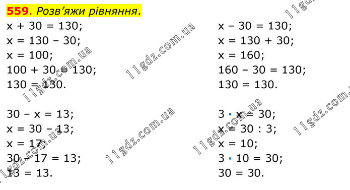Розв’яжи рівняння. х + 30 = 130; х = 130 – 30; х = 100; 100 + 30 = 130; 130 = 130. х – 30 = 130; х = 130 + 30; х = 160; 160 – 30 = 130; 130 = 130. 30 – х = 13; х = 30 – 13; х = 17; 30 – 17 = 13; 13 = 13. 3 ∙ х = 30; х = 30 : 3; х = 10; 3 ∙ 10 = 30; 30 = 30.