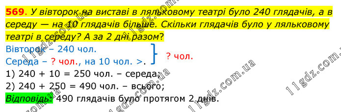 У вівторок на виставі в ляльковому театрі було 240 глядачів, а в середу — на 10 глядачів більше. Скільки глядачів було у ляльковому театрі в середу? А за 2 дні разом? Вівторок – 240 чол. Середа – ? чол., на 10 чол. >. 1) 240 + 10 = 250 чол. – середа; 2) 240 + 250 = 490 чол. – всього; Відповідь: 490 глядачів було протягом 2 днів.