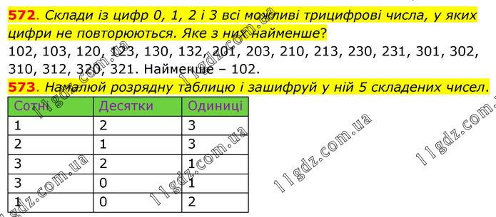 572. Склади із цифр 0, 1, 2 і 3 всі можливі трицифрові числа, у яких цифри не повторюються. Яке з них найменше? 102, 103, 120, 123, 130, 132, 201, 203, 210, 213, 230, 231, 301, 302, 310, 312, 320, 321. Найменше – 102. 573. Намалюй розрядну таблицю і зашифруй у ній 5 складених чисел.