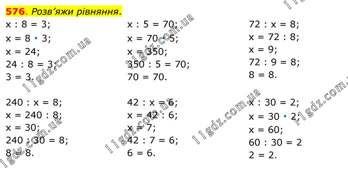 Розв’яжи рівняння. х : 8 = 3; х = 8 ∙ 3; х = 24; 24 : 8 = 3; 3 = 3. х : 5 = 70; х = 70 ∙ 5; х = 350; 350 : 5 = 70; 70 = 70. 72 : х = 8; х = 72 : 8; х = 9; 72 : 9 = 8; 8 = 8. 240 : х = 8; х = 240 : 8; х = 30; 240 : 30 = 8; 8 = 8. 42 : х = 6; х = 42 : 6; х = 7; 42 : 7 = 6; 6 = 6. х : 30 = 2; х = 30 ∙ 2; х = 60; 60 : 30 = 2 2 = 2.