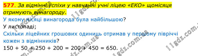 За відмінні успіхи у навчанні учні ліцею «ЕКО» щомісяця отримують винагороду. У якому місяці винагорода була найбільшою? У листопаді; Скільки ліцейних грошових одиниць отримав у першому півріччі кожен з відмінників? 150 + 50 + 250 + 200 = 200 + 450 = 650.