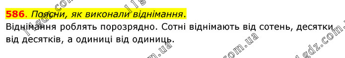 Поясни, як виконали віднімання. Віднімання роблять порозрядно. Сотні віднімають від сотень, десятки від десятків, а одиниці від одиниць.