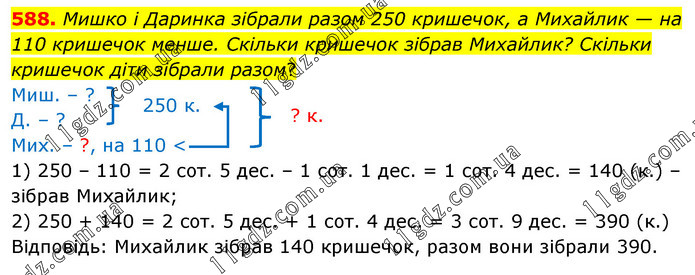 Мишко і Даринка зібрали разом 250 кришечок, а Михайлик — на 110 кришечок менше. Скільки кришечок зібрав Михайлик? Скільки кришечок діти зібрали разом? Миш. – ? Д. – ? Мих. – ?, на 110 < 1) 250 – 110 = 2 сот. 5 дес. – 1 сот. 1 дес. = 1 сот. 4 дес. = 140 (к.) – зібрав Михайлик; 2) 250 + 140 = 2 сот. 5 дес. + 1 сот. 4 дес. = 3 сот. 9 дес. = 390 (к.) Відповідь: Михайлик зібрав 140 кришечок, разом вони зібрали 390.