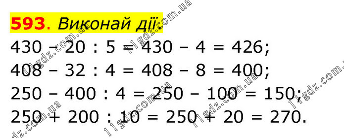 Виконай дії. 430 – 20 : 5 = 430 – 4 = 426; 408 – 32 : 4 = 408 – 8 = 400; 250 – 400 : 4 = 250 – 100 = 150; 250 + 200 : 10 = 250 + 20 = 270.