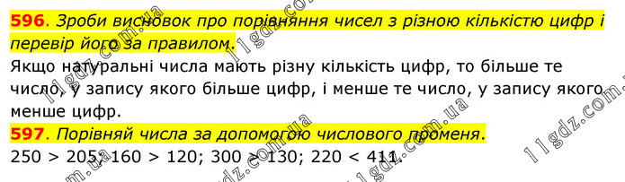 596. Зроби висновок про порівняння чисел з різною кількістю цифр і перевір його за правилом. Якщо натуральні числа мають різну кількість цифр, то більше те число, у запису якого більше цифр, і менше те число, у запису якого менше цифр. 597. Порівняй числа за допомогою числового променя. 250 > 205; 160 > 120; 300 > 130; 220 < 411.