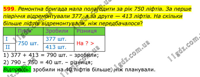 Ремонтна бригада мала полагодити за рік 750 ліфтів. За перше півріччя відремонтували 377, а за друге — 413 ліфтів. На скільки більше ліфтів відремонтували, ніж передбачалося? 1) 377 + 413 = 790 шт. – зробили; 2) 790 – 750 = 40 шт. – різниця; Відповідь: зробили на 40 ліфтів більше, ніж планували.