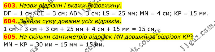 603. Назви відрізки і вкажи їх довжину. DF = 1 см; СЕ = 3 см; АВ = 3 см; LS = 25 мм; МN = 4 см; КР = 15 мм. 604. Знайди суму довжин усіх відрізків. 1 см + 3 см + 3 см + 25 мм + 4 см + 15 мм = 15 см. 605. На скільки сантиметрів відрізок МN довший за відрізок КР? MN – KP = 30 мм – 15 мм = 15 мм.