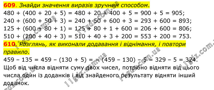 609. Знайди значення виразів зручним способом. 480 + (400 + 20 + 5) = 480 + 20 + 400 + 5 = 900 + 5 = 905; 240 + (600 + 50 + 3) = 240 + 50 + 600 + 3 = 293 + 600 = 893; 125 + (600 + 80 + 1) = 125 + 80 + 1 + 600 = 206 + 600 = 806; 510 + (200 + 40 + 3) = 510 + 40 + 3 + 200 = 553 + 200 = 753. 610. Розглянь, як виконали додавання і віднімання, і повтори правило. 459 – 135 = 459 – (130 + 5) = = (459 – 130) – 5 = 329 – 5 = 324. Щоб від числа відняти суму двох чисел, потрібно відняти від цього числа один із доданків і від знайденого результату відняти інший доданок.